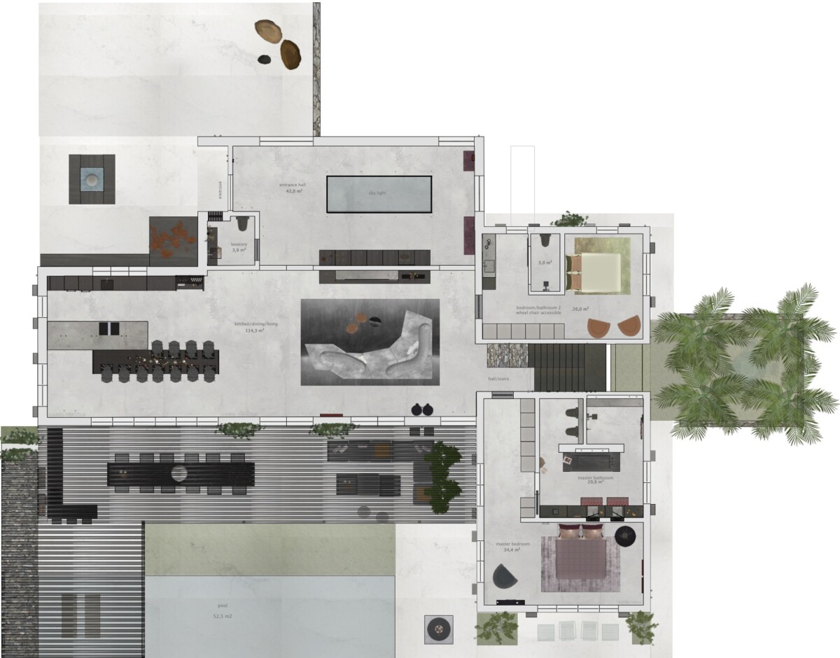 The approved plans reveal a residence of outstanding design, blending modern elegance with the timeless beauty of the island. The home will feature five expansive bedroom suites with en-suite bathrooms, a striking entrance hall, generous living and entertainment areas, a private bodega and a dedicated spa. A 42m² swimming pool (and a smaller indoor pool in the spa area) will take center stage, overlooking panoramic views of the rolling countryside. Thoughtfully integrated details such as underground parking, multiple storage rooms, and solar panels ensure both comfort and sustainability.